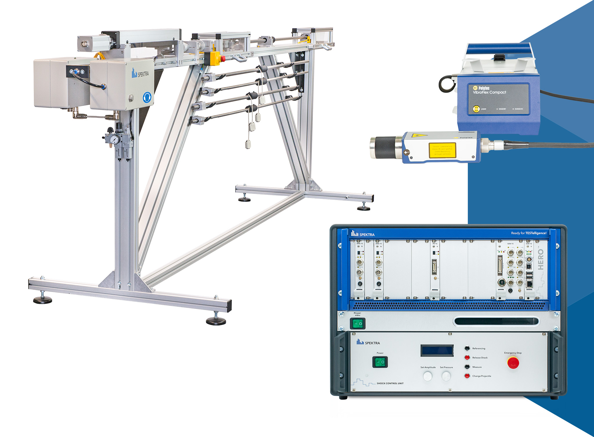 - System including HERO™ data acquisition device with signal conditioner, Shock Control Unit, SE-221 shock exciter, laser vibrometer (digital), and all accessories